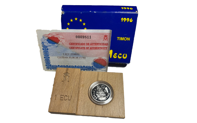 1 Ecu. Plata. 1996. Timón. Calidad PROOF. Con certificado, estuche y caja original