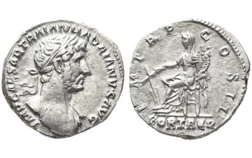 Denario. Plata. 118 d.C. Anv. Cabeza laureada de Adriano con el pecho desnudo, con el hombro izq. cubierto, a dcha.; alrededor leyenda IMP CAESAR TRAIAN HADRIANVS AVG. Rev. Fortuna sentada, a izq., sosteniendo un timón y una cornucopia; alrededor leyenda P M TR P COS II; en exergo leyenda FORT AVG.