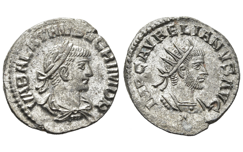 Antoniniano. Plata. 270-275 d.C. A/ Busto de Aureliano radiado y con coraza, a dcha.; alrededor leyenda IMP C AVRELIANVS AVG; debajo marca Δ. R/ Busto de Vabalato laureado y con coraza a dcha.; alrededor leyenda VABALATHVS VCRIMDR.