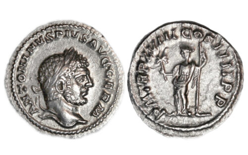 Denario. Plata. 215 d.C. Anv. Cabeza laureada de Caracalla, a dcha.; alrededor leyenda ANTONINVS PIVS AVG GERM. Rev. Pax drapeada, de pie, sosteniendo una rama con su mano dcha. y un cetro con la izq.; alrededor leyenda P M TR P XVIII COS IIII P P.
