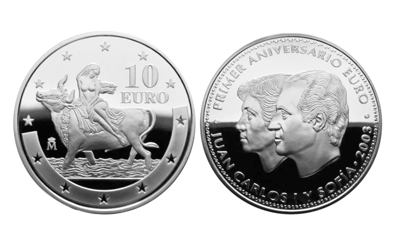 10 Euros. Plata (.925). 2003. Primer Aniversario del Euro. Rapto de Europa. Calidad PROOF.