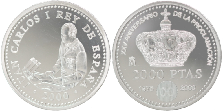 España 2000 Pesetas 2000 XXV Aniversario Proclamación Juan Carlos I PROOF