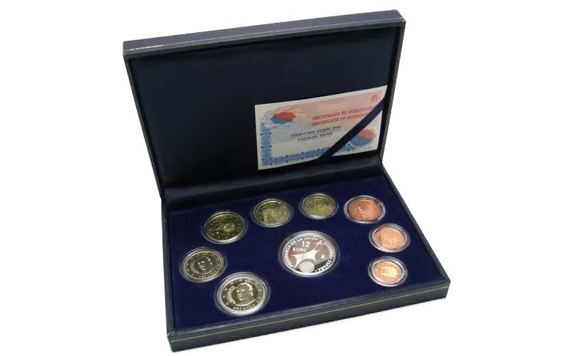 1, 2, 5, 10, 20, 50 céntimos, 1, 2 y 12 Euros. Plata. Cuproníquel. 2002. Estuche Oficial Serie Euros. Calidad PROOF.