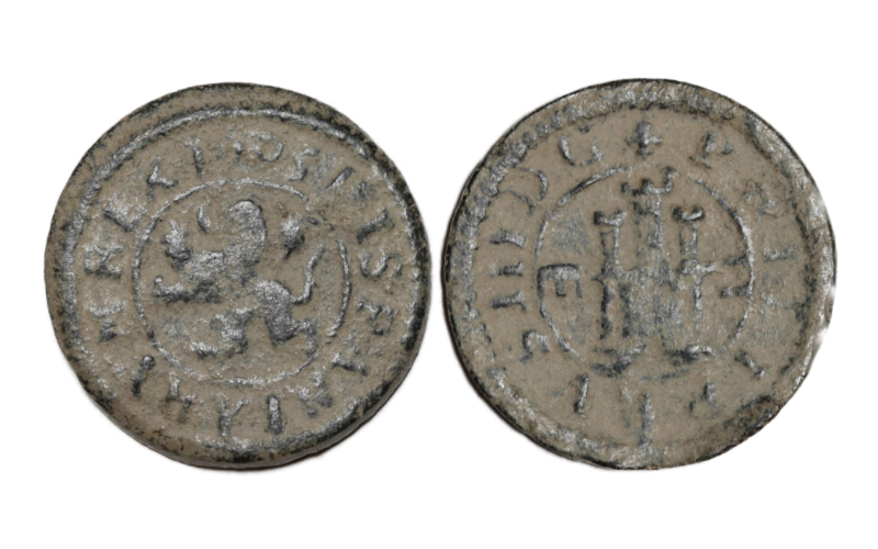 2 Maravedís. Cobre. 1605. A/ Castillo; a la dcha numeral II; a la izq. marca acueducto horizontal; alrededor leyenda PHILIPPVS III D.G. R/ León a izq.; alrededor leyenda HISPANIARVM REX 1605.