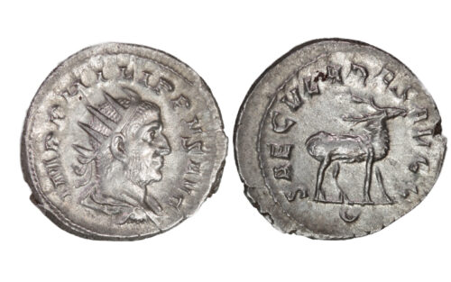 Antoniniano. Plata. 248 d.C. A/ busto de Filipo el Árabe, radiado, drapeado y con coraza, a dcha; alrededor leyenda IMP PHILIPPVS AVG. R/ Ciervo o Alce caminando hacia la dcha; debajo marca U; alrededor leyenda SAECVLARES AVGG.