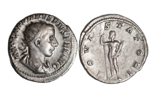Antoniniano. Plata. 241-243 d.C. Anv. Busto de Gordiano III, radiado, drapeado y con coraza, a dcha.; alrededor leyenda IMP GORDIANVS PIVS FEL AVG. Rev. Júpiter, desnudo, de pie y de frente, con la cabeza a dcha., sosteniendo un cetro largo con la mano dcha.; alrededor leyenda IOVI STATORI.