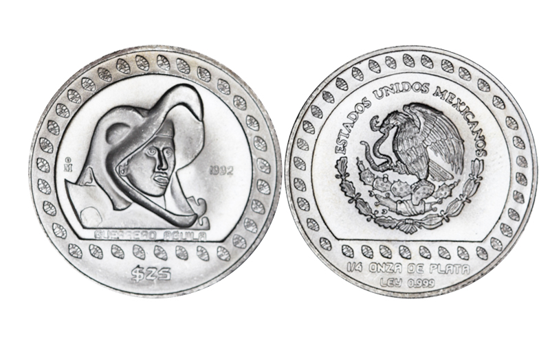 Serie 3 valores: 25, 50 y 100 Pesos (1/4, 1/2 y 1oz.). Plata. 1992. Guerrero Águila. Calidad SC
