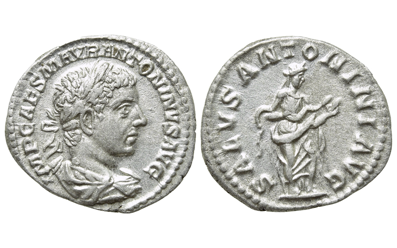 Denario. Plata. 218-222 d.C. Anv. Busto de Heliogábalo laureado y drapeado, a dcha.; alrededor leyenda IMP CAES M AVR ANTONINVS AVG. Rev. Salus drapeada y de pie a dcha., alimentando a una serpiente que sostiene en sus brazos con un plato en la mano izq.; alrededor leyenda SALVS ANTONINI AVG.