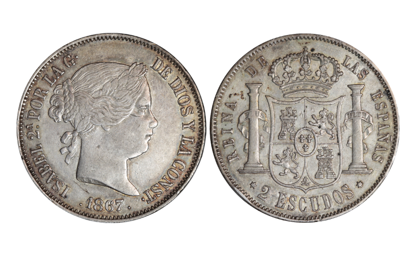 Isabel II 2 Escudos 1867 Madrid leve golpec. MBC-EBC
