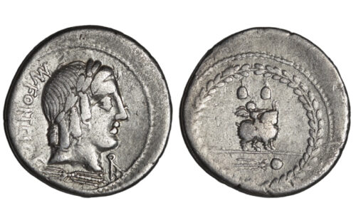 Denario. Plata. 85 a.C. Roma. Anv. Cabeza laureada de Apolo, a dcha., debajo rayos; alrededor leyenda MN·FONTEI·C·F / AP. Rev. Cupido sobre cabra, a dcha., arriba dos gorros frigios, debajo thyrsus (bastón ritual); alrededor corona de laurel. Peso: 3,53 grs. Diámetro: 21 mm. Ref.: RRC 353/1a. Calidad MBC-