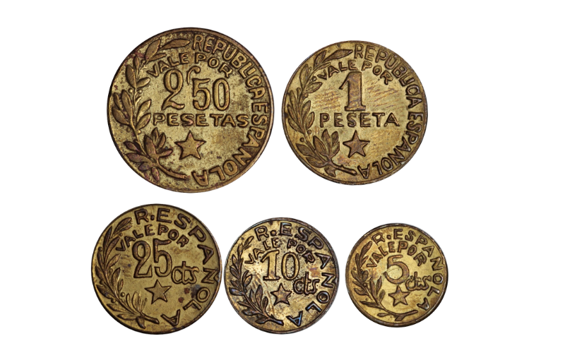 5, 10 y 25 Céntimos. 1 y 2.50 Pesetas. Latón. Ref.: AC-20-24. Calidad MBC a EBC