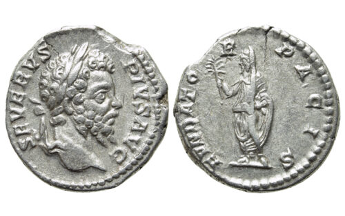 Denario. Plata. 202-210 d.C. Anv. Cabeza laureada de Septimio Severo, a dcha.; alrededor leyenda SEVERVS PIVS AVG. Rev. Septimio Severo, velado, togado, de pie a izq., sosteniendo una rama en la mano dcha. extendida y un rollo en la izq.; alrededor leyenda FVNDATOR PACIS.