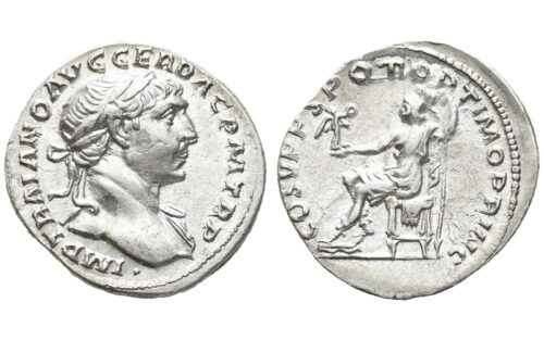 Denario. Plata. 103-111 d.C. Anv. Busto de Trajano, laureado y con el hombro izq. cubierto, a dcha.; alrededor leyenda IMP TRAIANO AVG GER DAC PM TR P. Rev. Roma con casco y atuendo militar sentada a izq., sosteniendo la Victoria sobre su mano dcha. extendida y una lanza recta con la izq.; alrededor leyenda COS V PP SPQR OPTIMO PRINC.