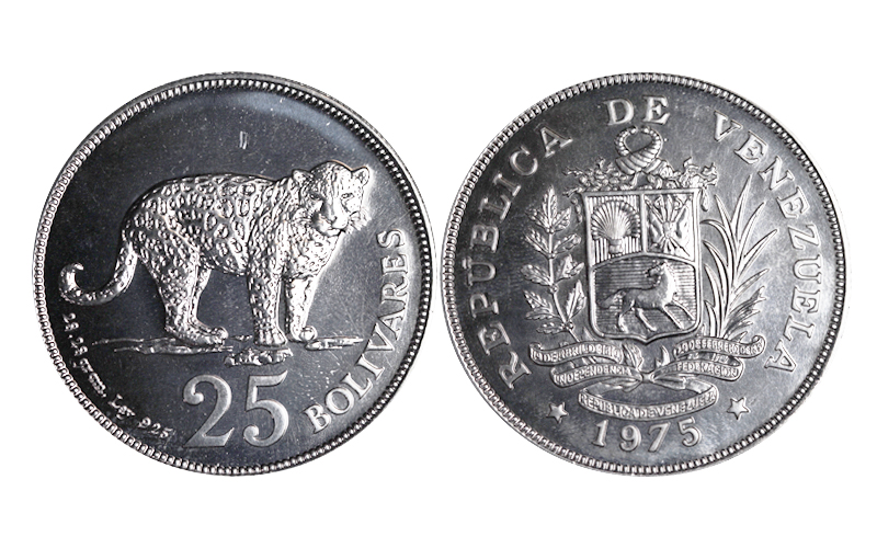 Y46. 25 Bolívares. Plata (925). 1975. Jaguar. Calidad SC.
